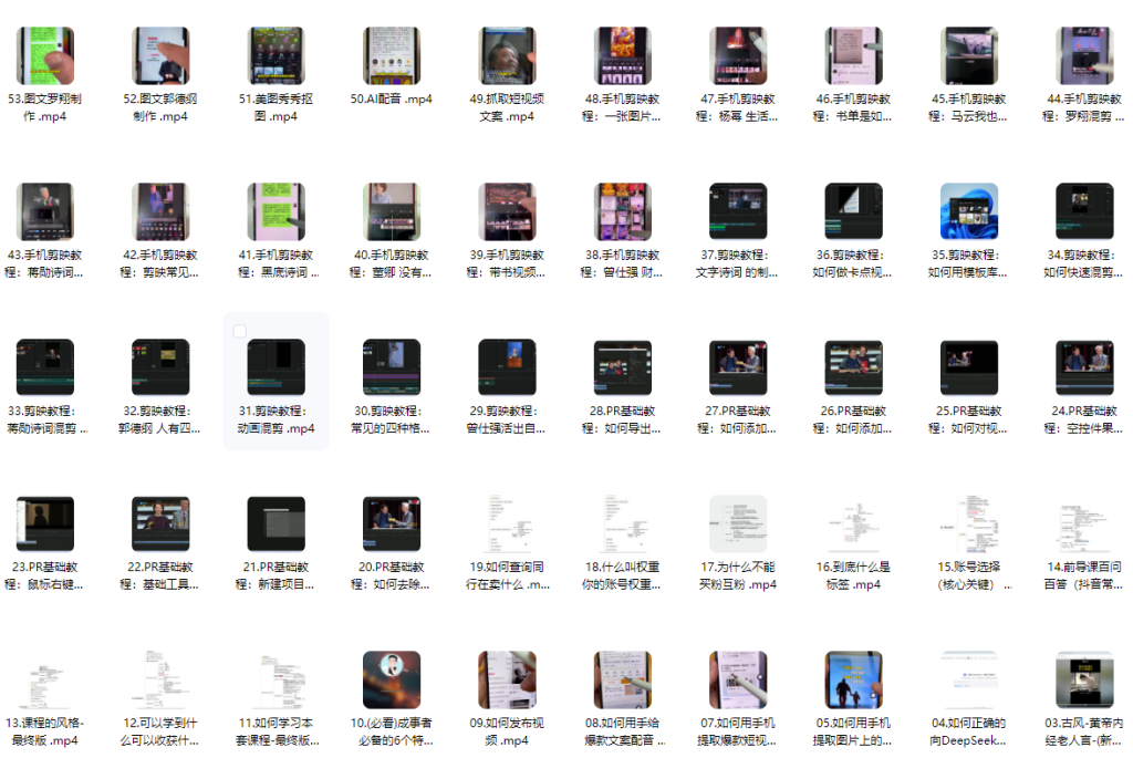 主要内容:解决账号权重、标签误区等核心问题,PR+剪映双教程覆盖电脑端到手机剪辑全流程,手把手教你去水印、加字幕、做卡点混剪。附赠爆款文案提取、AI配音、图文制作技巧,连查同行数据和书单视频模板都打包好。既有董卿罗翔案例拆解,也讲透账号运营底层逻辑,从发布视频到规避违规一网打尽。